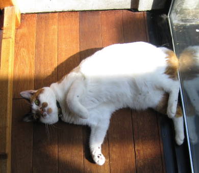 ![]() 2月28日(火) 快晴 暖かくなって来たのでなみすけが あちこちで気軽に転がるようになった。 もうちょっとくらい冷たい床の所で行き倒れても平気だ。 人間が通る所に転がっていて邪魔なので 「そこに居ると踏みますよ」と猫の真上に足を上げると 踏まれたい所(顎とか腹とか)をぐぐっと伸ばして 「さあどうぞ」というポーズを取るなみすけ。 いいからどきなさい。 |