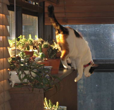 ![]() 8月30日(木) 快晴 目を覚ました夫に「なみすけ」と声をかけられて 多肉植物の棚から飛び降りるなみすけ。 ------------------------------------ 起きて来た夫と「おはよう」と夫に言う私の 間にずいっと割って入ったなみすけがいきなり 「ようようようようっ」と大声で 私に向かって何か言い出す。 なみすけの朝は今日も文句を言う所から始まる。 |