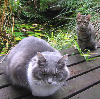 ![]() 12月13日(木) 快晴 あらあら、耳毛がちびこCを連れて来たよ。 という事はきっと一緒の家で飼われているのね (うちの常連猫の大半が御近所の 同じ家の飼い猫らしく思われる)。 扉を少し開けてやったらちびこCが近付いて来たが 耳毛が「ダメ」とちびこCの首のあたりを 前脚で押さえて制止した。 その後も池に脚を突っ込んで遊ぶちびこCを 耳毛がじっと見守っていたので 耳毛が指導係なんだ、偉いねえと思って見ていたけど 耳毛は何もしていないちびこCの頭も いきなりぽかっと殴っていたので 教育的指導ばかりでもないようだった。 そのうち2匹で一緒に帰って行きました。またおいで。 |