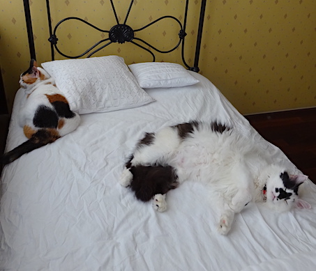 ![]() 7月12日(水) 快晴 寝る姿にも性格が出る。 ------------------------------------ 「今日暑いから気を付けなさい。 自分で涼しい場所を選んでね。 私の部屋は基本冷房を入れておくから」と 言い聞かせたにも関わらず、 なみすけは敢えて日光がばんばんあたる 南向きの窓とカーテンの間に位置を定め、 文は私の部屋の前でひっくり返って なんだかぐったりして見えたので ずるずると中まで引っ張って エアコン前の床が冷えているところまで移動させたが そこでしばらく寝返りを打って遊んだ後で 立ち上がって出て行って やっぱり元の場所に戻ってぐったりと横になった。 なみすけも文も大丈夫なのかい。 |