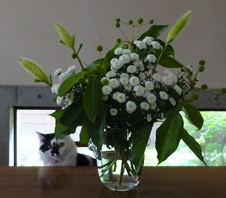 ![]() 7月18日(火) 快晴 目を離すと文が葉っぱに食いついたり 穂にパンチを入れたりするので 人間が場を離れるときは花瓶を 猫から見えない場所に持って行って隠す。 なみすけをつかまえてブラシをかける。 なみすけの鳴き声を聞きつけて 音もなく文がやって来る。 足元に横たわって順番待ちをする文はもう 夫が居ないので私がブラシ担当だという事を すっかり理解しましたが、 今晩夫が帰って来るので 明日のブラシかけ会場は 元の場所に戻りますよ。 本日の亀餌 ・青梗菜 ・茄子 ・椎茸 ・大葉 |