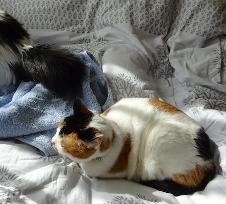 ![]() 7月24日(月) 快晴 なみすけが夫の部屋の棚のかごに、 文が洗面室の床に居る事を確認して 自分の部屋に戻って 静かに扉をだいたい閉めて ひさしぶりに自分ひとりの部屋を満喫しようと 横になって目を閉じた数十秒後に 「どすっ」とベッドが沈む衝撃を感じて びっくりして目を開くと すでに扉が全開になって なみすけが私の顔をのぞき込んでいて 起き上がって床に足を降ろそうとすると そこには文が広がっていて あやうく尻尾を踏みそうになった。 油断するなよと猫に言われているような気がしました。 |