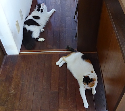 ![]() 7月28日(金) 快晴 暑い日が続いております。 札幌の義妹からも1通の中に3度も 「暑い」と書かれたメールが来ております。 昨日の午後は洗面室からしばらく 炎天下のバルコニーを見て考えましたが 外に出て行く勇気が出ずに 洗濯物を室内に干しました (それでもあっと言う間に乾きました)。 猫達は家の中であちこち移動しておりますが 特に涼しいところに居るわけでもなく 西陽の当たる夫の部屋や 上に行くほど暑くなる階段に座っている事もたびたびで 自分で選んだ場所なので大丈夫だろうとは思うのですが うっかり熱中症にならないか心配だ。 私の部屋と、あと地下がまあまあ涼しいよ。 |