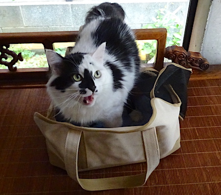 ![]() 8月13日(日) 雨 昨日は文の混合ワクチン接種。 前の日の夜に夫がキャリーバッグを居間に出すと そわそわと頭を突っ込んで匂いをかいで 文はバッグから出たり入ったり。 病院で計った体重は6.3kg。 「肥満」ではなく「大きい猫」で ただし文は今3歳、 そろそろ代謝が落ちてくる年齢になるので あまり体重を増やさないように 注意してくださいとの事でした。 それでワクチンは問題なく済みましたかと 連れて行った夫に聞くと 「とても簡単に『たすっ』と打たれた」そうで、 夫がバッグを片付けようとすると 文は小さく鳴いて文句を言いました。 文はキャリーバッグが大好き。 |