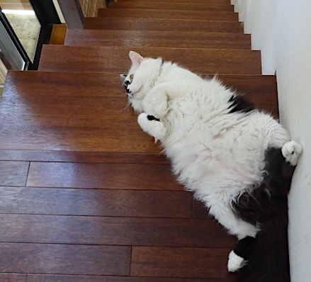 ![]() 9月26日(火) 快晴 踊り場でひっくり返っている文の横を 文のスイッチが入らないように できる限りの距離を取って 息をひそめて静かに通り抜けたつもりだったが 急いで階段を降り始めたところで スカートがひるがえってしまって すばやく前脚を伸ばした文に 後ろから爪をかけられ スカートを引っ張られて 強い力で引き戻された。 危険だしちょっと怖かったのでやめてください。 |