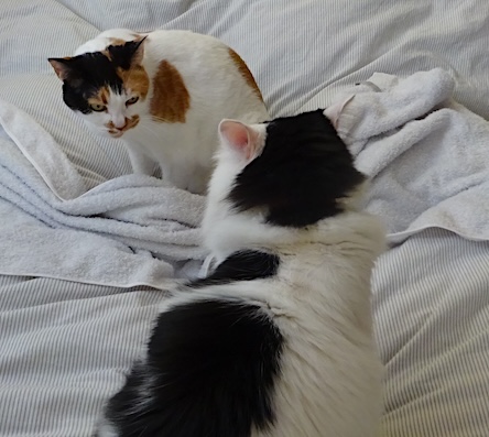 ![]() 10月24日(火) 快晴 すごむなみすけ。 遠隔会議が終わった夫が 「猫は居ますかー」と言って 私の部屋にやって来たので 義妹にメールを書きながら 「たくさん居ますよ」と返事をすると 窓下で太陽の光にあたたまっていたなみすけと 猫ベッドに詰まっていた文が 同時に頭を動かして夫を見たので 「本当だ」と言った夫は まず相手の出方を見ながらゆっくりとなみすけを、 続いて何か話しかけながら文を撫でてやって 猫を満喫して帰って行きました。 |