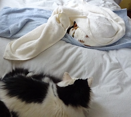 ![]() 2月26日(月) 快晴 映画を見て酒を飲んで 少し遅めに帰宅した一昨日、 居間で夕刊や郵便物を 片付けようとしていてふと気付くと 収納の上に置いてあった 買ったばかりのチーズ鱈が パッケージをびりびりに破られて 中味をぶちまけられておりました。 破壊活動が楽しかっただけで 食べてはいないようでしたが、 やったのはどっちだと思いましたが 先程猫トイレの片付けをしているときに 後ろで変な音がしたので振り向くと 文が猫トイレ砂の袋に牙を立てて ぐいぐい引っ張って行こうとしていたので 断定は出来ませんがやったのはやっぱり多分文ですね。 |