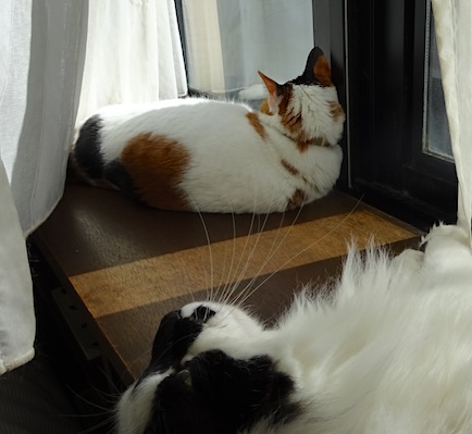 ![]() 3月3日(日) 晴 私のベッドの上で2匹が ほどほどの距離で寝ていた。 次に見に行くとなみすけが 陽の当たる窓に移動していた。 追いかけるように起き上がって 至近距離を通った文になみすけは 「い」と軽く文句を言っただけで許して 文も窓際の少し離れた場所で落ち着いた。 仲いいじゃんとカメラを取りに行って戻ったら なみすけは文に完全に背を向けて 文は裏返しになってぼんやりと天井を見詰めていた。 なかなかほのぼのとする写真が撮れない。 明日から札幌です。 |