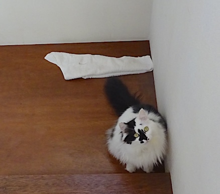 ![]() 3月14日(木) 快晴 これは取り込んだ洗濯物を いったん3階の手摺にかけておいたのを すばやく叩き落として階段の隙間から 1階まで落ちるタオルを追いかけて行ったので 思わず「取って来い!」と叫んだ自分の声に 取って来るはずないなとため息をついて 残りの洗濯物を畳み終わった私が 振り返ると本当に下の踊り場まで 拾ったタオルを持って来ていた文です。 |