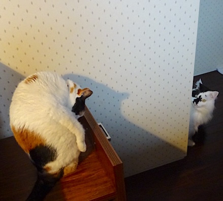 ![]() 3月27日(水) 快晴 「猫は居ますかー」と夫が私の部屋にやって来た。 何か猫に話しかけつつ なみすけがくるまっている猫タオルを ちょっと持ち上げて中をのぞいて なみすけが「う」とうめいたので手を引っ込めて、 割り込んで来た文の頭をぐりぐりと撫でてやって またなみすけにさわろうとしてを 何度も繰り返していたので 「ついでにかけてやって」とブラシを渡したら 「おう」と夫が文を抱き上げようとしたので 「なみすけが先」と言うと 「あっ、なみすけか。それは出来ない」と きっぱりと言った夫は私にブラシを返して 立ち上がり背を向けて去って行った。 ダメじゃん。 |