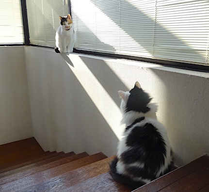 ![]() 4月15日(月) 快晴 それぞれの思いを胸に 見つめ合う猫達。 ------------------------------------ なみすけにブラシをかけるときは毎回大騒ぎ。 背中からかけ始めて文句を言い始めたら 頬のあたりに軽くブラシをかけてなだめて ひっくり返して腹側に移って なみすけが本気で怒り出すタイミングで 手を離すとそれと同時に その手を蹴ったなみすけが ベッドから飛び降りて、 偶然そこに居た文に 至近距離で渾身のブシャーをかまして走り去った。 文はまったくのとばっちりであった。 |