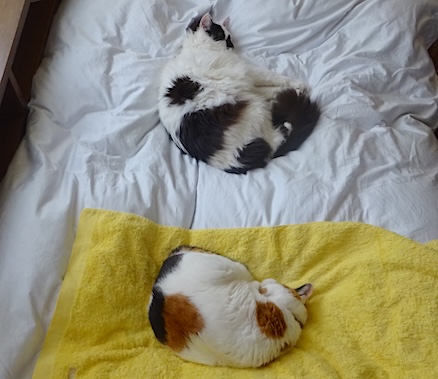![]() 7月10日(水) 快晴 階段を駆け上がって来るなみすけの後ろから 文も走って追いかけて来て なみすけが俊敏にサイドデスクに飛び上がって そのままの勢いで細い隙間を抜けたので (なみすけ15歳、やるときはやる) ついていけなくなった文が 棒立ちになって見送って 一瞬の静けさの後で 「ううーん、がっ」と言葉にならない叫びを発して 明後日の方向に走り去った。 文の情熱の行き場がないのう。 |
