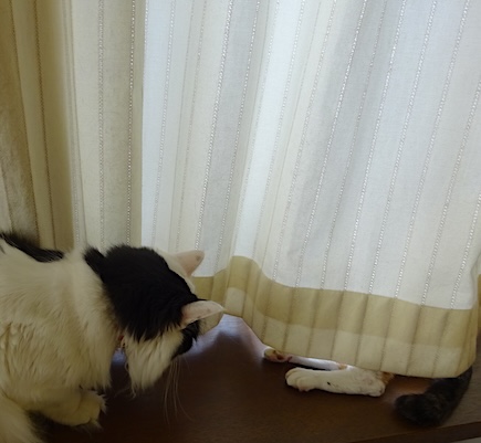 ![]() 8月8日(木) 曇り 昨日帰って来ました。 夜に結構な雨となって雷がびかびか光って、 なみすけは8時くらいにもう枕の横に丸まって 寝る体勢を作っていたのですが 文はどこに行ったのかしら。 夫の部屋にも洗面室にも見当たらず、 本棚にもカーテンの間にも 段ボール(資源ごみ)にも挟まっていなくて 居ないはずはないんだけれどと 3階から地下まで汗だくになって2周探して 困って「ブンー」と中くらいの声で呼んでみたら 文がぴょるっと地下物置の 猫砂の奥から出て来ました。 文は呼ぶと出て来るんだね。 |