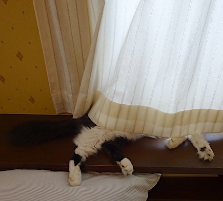 ![]() 8月24日(土) 快晴 カーテンをふくらませて寝ていた文が だんだんこちら側にはみ出して来て 時折脚先を「ぴくっ」と動かすなどしているところに 静かになみすけが近寄って もしゃもしゃと毛のはみ出している文のアシの裏に 鼻をくっつけるようにして匂いをかいで もう一方の脚の匂いも確認して さらにふさふさの尻尾の匂いも丹念にかぐという 文にとって幸せな事が起こっていたのですが 文はとてもよく寝ていたので その事に気付かないままでした。 文、残念だった。 |