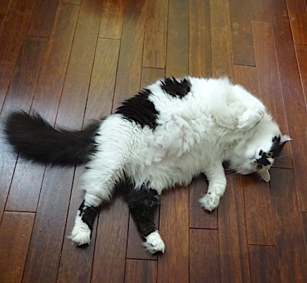 ![]() 8月27日(火) 晴 そろそろ夫を起こそうと 自分の部屋を出て 階段を上がったところで 文のシリと尻尾が「すっ」と 夫の部屋に入って行くのが見えたので 扉から様子をうかがうと 鳴きながら夫に近付いて行った文が 起きない夫の枕の横で ゆっくりと立ち止まって夫に背を向けて もしゃもしゃした黒い尻尾を ふっさふっさと揺らし始めた。 一瞬の間をおいて夫が 顔の前を払う動きをしたと思うと 跳ね上がるように寝返りを打ったのを見届けて 私は夫の部屋を後にしました。 文、そこはおまえにまかせた。 |