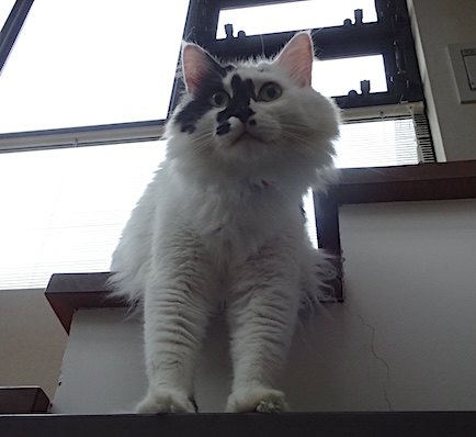 ![]() 8月30日(金) 雨 天気は荒れ模様で前脚は太い。 ------------------------------------ 文が洗面室でひっくり返っていたので 「ブンちゃん体重はかろっかー、 減ったかなー、痩っせたっかなー」 と歌いながら抱き上げて 「うわ、重い」と体重計に乗せると 6.85kgで変わらないというか微増。 10日ほど前に肥満傾向の成猫用フードに替えたから 少し減っているかと思ったのだが、 なぜ痩せぬ、文。 |