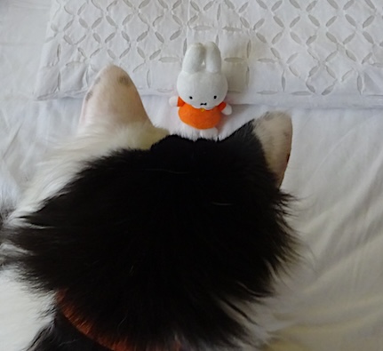 ![]() 9月12日(木) 快晴 まだまだ暑い 巨悪に立ち向かうミッフィーちゃん。 ------------------------------------ 文が気に入っている段ボール箱に ミッフィーちゃんの指人形を入れておくと 気にせず入って一緒に眠る文ですが なかなかそれ以上に積極的には ミッフィーちゃんで遊ばない。 「取って来い」をするといいのになと思って 指人形を動かして文に見せて 「こんにちは、私はミッフィーちゃん。 吉祥寺から来たの。1980円(税込)もするのよ、 案外お高いんです」と話しかけていると 「ミッフィーちゃんはそういう事言わないと思うよ」と 通りすがりの夫が私をたしなめた。 私もそう思う。 |