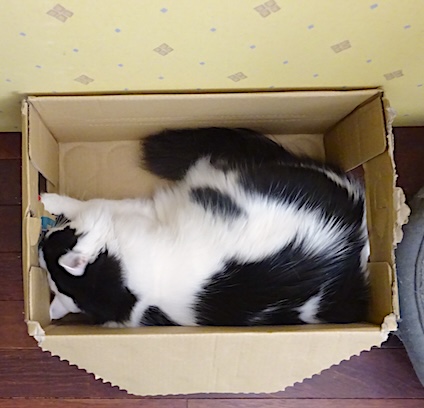 ![]() 9月19日(木) 曇り ペットボトルの箱が空いたので 畳もうと思って廊下に持ち出して 「がさ」といわせた次の瞬間に もう文が走ってやって来て 私が段ボールの接着部分をはがそうとしている横から 「どすっ」と飛び込んで箱いっぱいに広がって 強く私にアピールする。 猫が入って遊びます! 底で爪を研いだり持ち手の穴をむしったりします! まだ畳まないでください! まだ畳まないでください! しょうがないなー、もー。 |