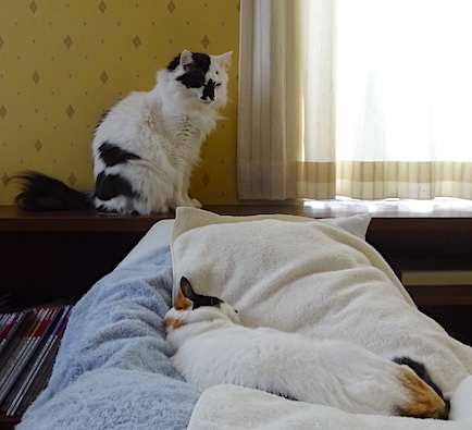 ![]() 10月10日(木) 曇り なみすけが水を飲み始めたところなのに文が気付いて 「ニャッニャーン!」と一声鳴いて走り寄って 対応が遅れたなみすけにからだをすり寄せ 顔をくっつけ匂いをかいでやりたい放題。 まずいぞと成り行きを見守っていたのですが 文の無礼に対してなみすけは 怒るでもなくかわすでもなく 前脚後ろ脚に力を入れて 「ここに居る猫は私ひとり。 うすらでかい猫など存在しません」 という態度で堂々水を飲み続けて かまわれようとじゃれつく文を完全無視。 文も何かを感じたらしくて すっとからだを引いてなみすけから離れて そのまま去って行きました。 なみすけのそういう戦い方は初めて見たな。 |