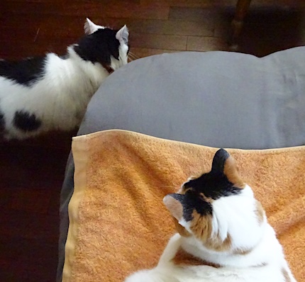 ![]() 11月29日(金) 快晴 朝に猫のトイレ掃除をして 猫皿を洗って水と餌を出す。 なみすけにはサイエンスダイエットの シニアプラスに少量のかつおぶしを混ぜてやる。 文にはロイヤルカナンの消化器サポート。 キッチンスケールでドライフードを計っていると 隣の寝椅子からそわそわと 文が伸び上がるのは毎朝の事だが、 いつもは2階で寝て待つなみすけが 今日はちりんとすずを鳴らして ゆっくりと階段を降りて来た。 静かに背後で立ち止まるなみすけ、 鼻息がかかるほどの距離で見つめる文。 少々緊張した事です。 |