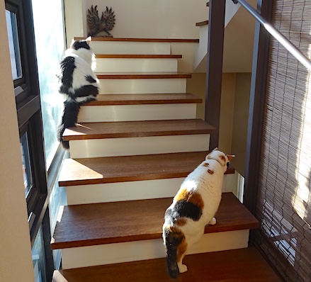 ![]() 1月23日(木) 晴 「うぉうおおう」と穏やかでないなみすけの声が響いたので また喧嘩かいと様子を見に行くと サイドキャビネットの上で怒るなみすけに 伸び上がった文がしつこく迫っている。 やめなさいと数回言っても 文が引かずになみすけがうなり続けるので なみすけの声に重ねて私も 「うぉうおおう」と真似をしてみたら 文がさっとこちらを振り返った。 なみすけも鳴くのをぴったりと止めて私を見た。 2匹が同じ表情をして動かず私を凝視している。 いや、佐々木御乱心とかそういうのではないので 2匹とも心配しないでください。 |