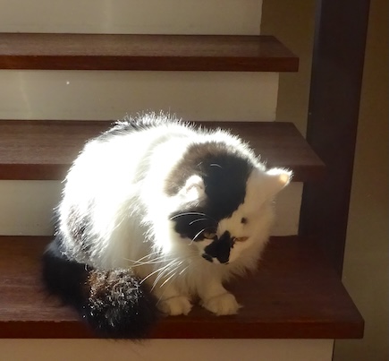 ![]() 1月24日(金) 快晴 歩いている人間が次に足を置くスペースに 文がわざとにすべり込むのである。 そのまま押し合って一緒に歩こうとしたり 急に立ち止まって伸びをしたりするので その都度あわてて立ち止まったり あやうくよけたりするのだが しかし少々ぼんやりしているとは言え文は猫、 猫ならば危ないと思ったら するっと回避するだろうよと 敢えてそのまま足を進めてみた。 尻尾を踏んだ。 小さく鳴かれた。 文…。 |