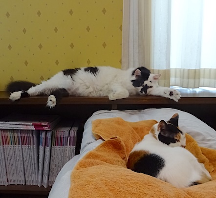 ![]() 9月9日(火) 晴 最近この位置で寝ている事が多い2匹。 ふとんの上の猫タオルがなみすけの定位置で 文は棚の上に落ち着いて、 なみすけは文に背中を向けて 文はなみすけを見つめて そのうち目を閉じて寝に入ったり 私が入って行くと2匹一緒にこちらを見たり。 仲がいいとまではいかないが、 それなりの安定である。 |