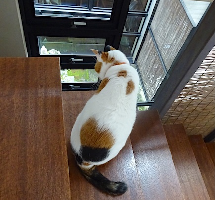 ![]() 9月10日(水) 晴 昨日の午前はメンテナンス工事で 現場監督と職人さんがふたり来ました。 私の部屋でなみすけはいつものように平常心、 文はいつものように収納の奥に詰まっていましたが しばらくして上には来ないようだと判断して おそるおそる出て来たあたりで なみすけが静かに起き上がって ゆっくりと部屋を出て行ったので 文も激しい迷いを見せながら後をついて行って でもやっぱり文だけすぐに帰って来ました。 写真は階段を数段降りたところで 1階の工事の進捗を見守るなみすけ。 |