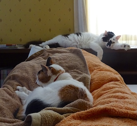 ![]() 10月17日(金) ひさしぶりに快晴 雨で気温が上がらなかった昨日の夜、 猫の世話をいろいろ済ませて 夫の帰宅が遅い日だったので ひとり分の皿を並べるなどしているところに めずらしくなみすけが降りて来て 私を見つめて無言の圧力をかける。 寒いので暖房が入ると思って来たんですけれども。 入ると信じているんですけれども。 人間としては暖房を入れるほどでは ないなと思ったのですが いいトシの猫の言う事なので じゃあちょっとだけつけようかと ガス暖房のスイッチを入れる。 慣れた様子でなみすけが 私の向かいの椅子に飛び乗る。 それを離れて見ていた文が 私の横の椅子に上がって 冬のフォーメーションが出来上がる。 なみすけと文には この前の冬の記憶があるのかな。 |