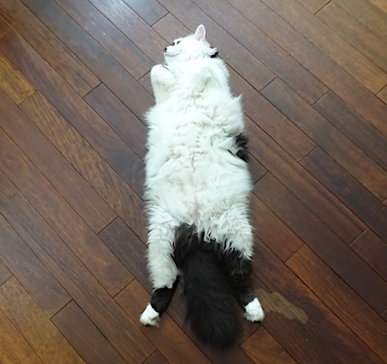 ![]() 10月18日(土) 晴 自分の部屋に戻って一歩入ったところで 「お」とつぶやいて足を止める。 文が白くて広い腹を見せてひっくり返っている。 何かを期待されている感じがしたので 手を伸ばして腹を軽く撫でてやると 文が首毛の向こうで頭を上げて 目を丸くして「ピャッ?」と鳴いた。 「撫でろ」のポーズかと思ったが違った。 ただ純粋に「腹を上に向けて寝ている」だけの文だった。 |
