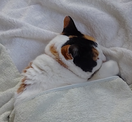 ![]() 10月23日(木) 晴 ベッドに寄りかかって 録画しておいたドラマを見ていると 背後の猫タオルの小山から 「キャッ」という小さい声が聞こえた。 なみすけが夢を見ているのだった。 後ろ手にタオルに手を突っ込んで 頭と思われるあたりを撫でてやると一瞬おいて なみすけが「ぶぶぶぶ」と振動し始めた。 切り替わるように悪い夢が終わって なみすけは寝たままゴキゲンになっているのだった。 いいねえ。 |