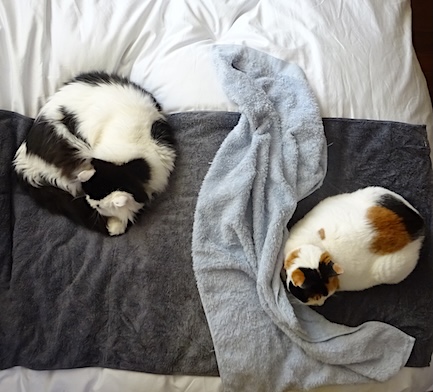 ![]() 2月1日(日) 快晴 窓際に少し離れて座ったなみすけと文が 同じ方向を向いていたので 私も外を見てみると 数メートル離れた木の枝に 鳩がとまっているのだった。 文は「誰ですか!鳩ですか!」と 目を見開いて見ているのだが なみすけは心持ち頭を低くして 口を小さく動かして チャッチャッと聞こえるか聞こえないかくらいの 音を立てているのだった。 なみすけと文では考えている事が だいぶん違いそうでした。 |