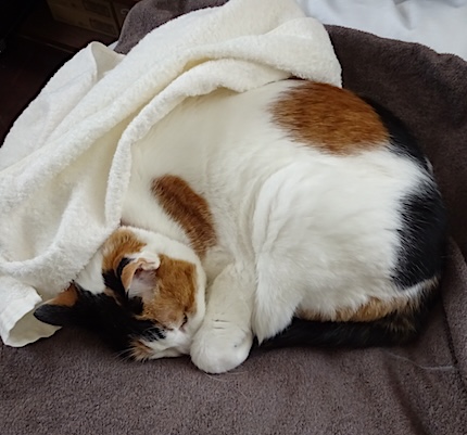 ![]() 2月2日(月) 晴 夜中に戻って来たなみすけの 耳や頬や顎のあたりを掻いてやる(というか 適当に手を動かしているとなみすけが 掻いて欲しい場所を押し付けて来る)。 しばらくするとなみすけが前脚を上げて 冷たい足の裏で軽く私の手を押さえて止める。 ゆっくりと歩いて枕元まで移動する。 ふとんを持ち上げてやると「すっ」と入る。 私達の意思の疎通は なかなか素晴らしいなと思いました。 |