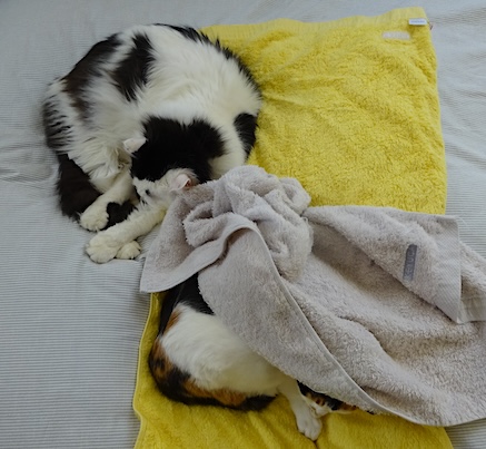 ![]() 2月14日(土) 快晴 階段を降りて行く途中で 上がって来るなみすけと出会う。 すれ違おうと互いにちょっと避けたところに 背後から「ニャッニャーン」と声がして 文が走ってやって来る。 瞬時に目つきが変わるなみすけ。 通せんぼをして遊ぶ気満々の文。 私の左に行くと見せかけて すばやくぎりぎりの逆を抜くなみすけ。 まんまと引っかかって体当たり気味に私を追い越して 若干脚をすべらせながら走り去って見えなくなる文。 そういうの本当に危ないからやめてください。 |