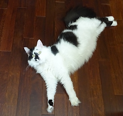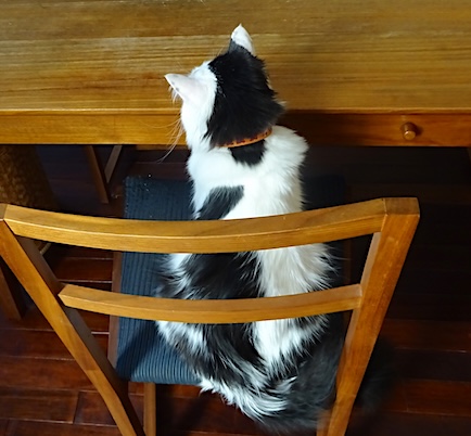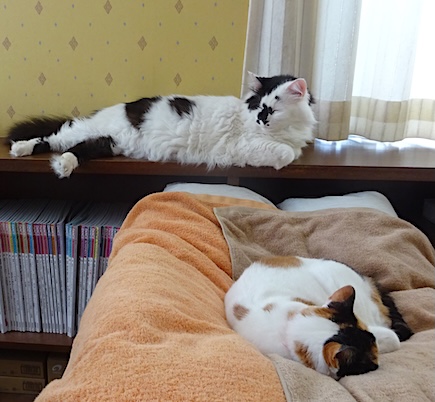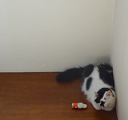 ![]() 10月11日(土) 曇り 寒い ミッフィーちゃんと文。 ------------------------------------ ドライフードはすでに肥満傾向の猫用、 猫おやつも人間の食べるものも 一切与えていないので 体重を減らすために文に出来る事は もう後は運動しかない。 ひさしぶりに「取って来い」を やってみようと思って 居間の猫用段ボール箱の隅っこに詰まっていた ミッフィーちゃんを持って来て 軽く振って文の注意を引いてから 「取って来い!」と階段から下に投げてやると 追いかけて階段を駆け降りた文は 踊り場のミッフィーちゃんの匂いをかいで確認して 階段を駆け上がって戻って来て 目を丸くして私を見上げた。 文、「取って来い」なんですよ。 「見に行って来い」じゃないんですよ。 |