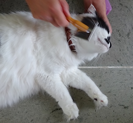 ![]() 10月5日(日) 曇り 夫の左手の向こうに見えているのは シリコンブラシのトレルンダ君(商品名)長毛用。 ブラシかけが嫌いななみすけの担当は私で ブラシかけが大好きな文の担当は夫。 朝に顔を洗った後で夫がバスマットの上に座って 「文、ブラシ」と促すと自分から夫に近付いて行く文。 夫に「ゴロン」と言われて少し考えるそぶりを見せる文。 しばらく待った後で夫が 「文、ブラシをかけて欲しいならゴロン」と言うと 夫の膝の前で自分からゆっくりと倒れる文。 「ヨシ」と言ってブラシをかけ始める夫。 夫、よく教えたなあ。 |